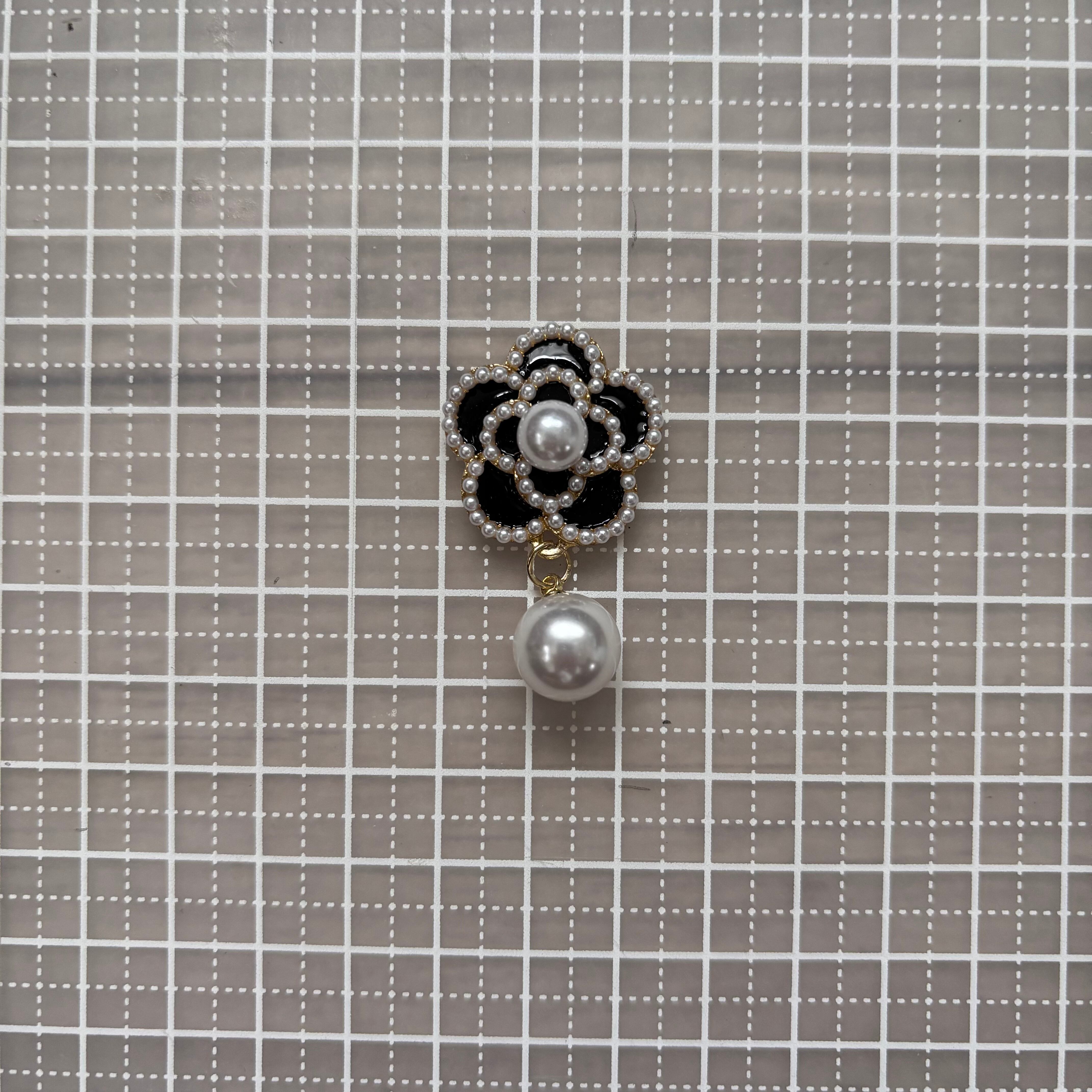 ぶら下がりパール・ストーン風チャーム付き上品なカメリアパーツです。